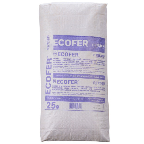 Экофер используется для комплексной очистки воды до нормативов СаНПиН. Водоподготовки для бассейнов, работы с окислителями, и наличием сероводорода в исходной воде. При прохождении воды через EcoFER железо Fe²+ и марганец Mn2+, растворенные в воде, образуют осадок (гидроксиды железа и марганца), который задерживается в толще загрузки и потом легко удаляется из нее при промывке системы (регенерации).