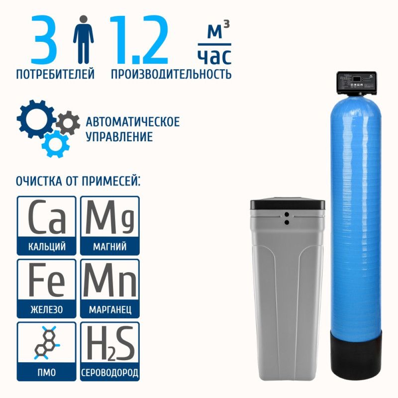 Комплект представляет собой фильтр комплексной очистки от железа, марганца, солей жесткости, природной органики.
