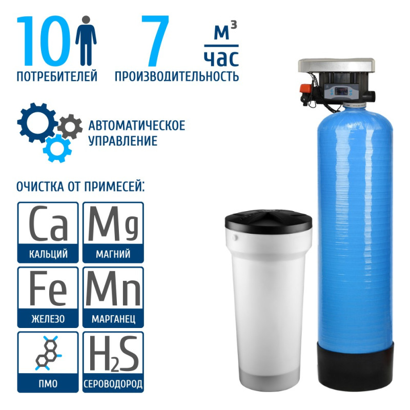Комплект представляет собой фильтр комплексной очистки от железа, марганца, солей жесткости, природной органики.
